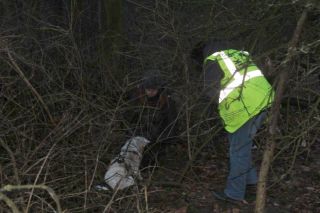 In der Zwischenzeit macht sich das Team bereit. Der Hund bekommt ein Halsband und ein Geschirr angelegt. Dann brauchen wir noch eine Leine ca. 5-7m lang. Die Leine wird am Halsband befestigt. Nachdem Meryem zurück ist, geht es los. Kurz vor dem GA wird der Hund vom Halsband aufs Geschirr umgeschnallt und erhält am GA das Kommando „riech“ und „trail“. Der Hund sollte deutlich nach vorne arbeiten, und die Leine sollte immer auf Spannung bleiben. Hilfestellung während des Trails bekommt man von der Trainerin. Die restliche Gruppe (ohne Hunde) geht im Abstand mit. |